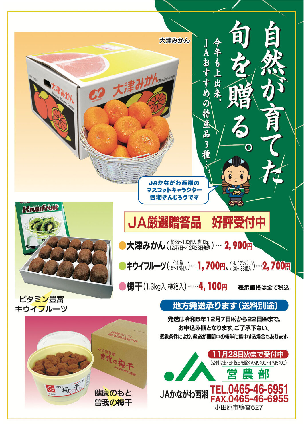 JA西湘管轄エリア内で生産している農産物・加工品の「みかん」「キウイフルーツ」「梅干し」の冬ギフト用チラシを毎年制作。販売数量や価格、注文方法など変更にもその都度対応。地域の名産品の美味しさを伝えています。