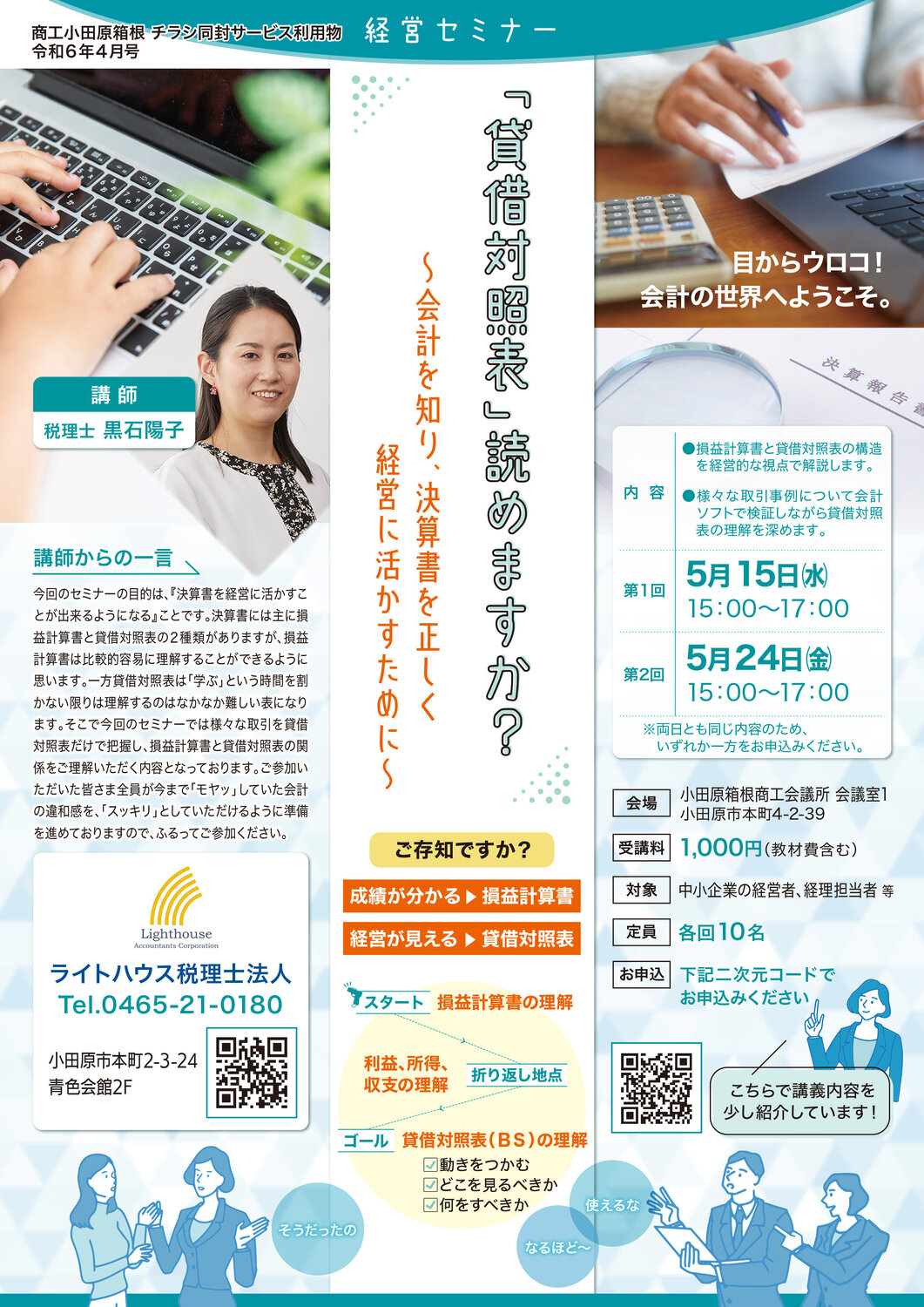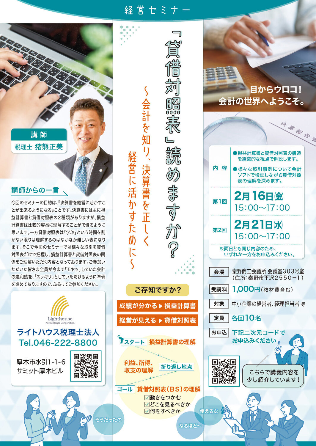 厚木市や小田原市、町田市に拠点を構えるライトハウス税理士法人様が主催のセミナーのご案内です。猪熊代表の気さくな人柄や、貸借対照表や損益計算書について、分かりにくかったものがスッキリし、頭に入るセミナーであることを、全体の色調などで表現させて頂きました。