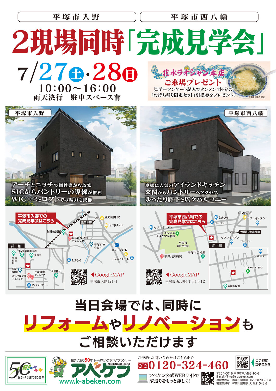 株式会社阿部建業(本社/平塚市)は、地元平塚で創業55年の注文住宅やリフォームなどを手掛ける会社。定期的に現場見学会を行っており、今回も現場見学会のチラシを作成いただきました。両面刷りのため表と裏で内容の差別化を図り、見やすいデザインを心がけました。
