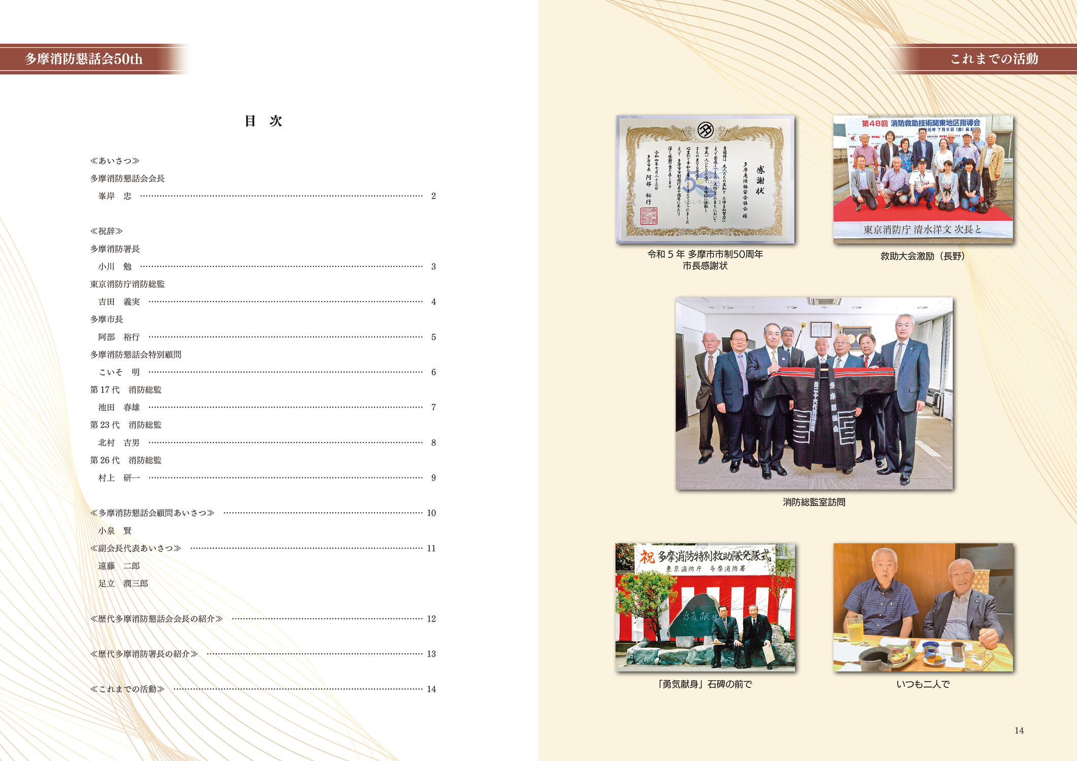 東京消防庁多摩消防署の活動を支援する団体「多摩消防懇話会」が設立50周年を迎えたことを記念する冊子。多摩消防懇話会の会長あいさつをはじめ、会員の思い出と、多摩消防署長や多摩市長、消防総監による祝辞などで構成しました。多摩消防署の担当者の方と打ち合わせを繰り返し、歴代会長や歴代署長の名前、活動写真を入れることで、会員の方に喜んでもらうことを意識して制作しました。記念誌は50周年記念式典で配布されました。