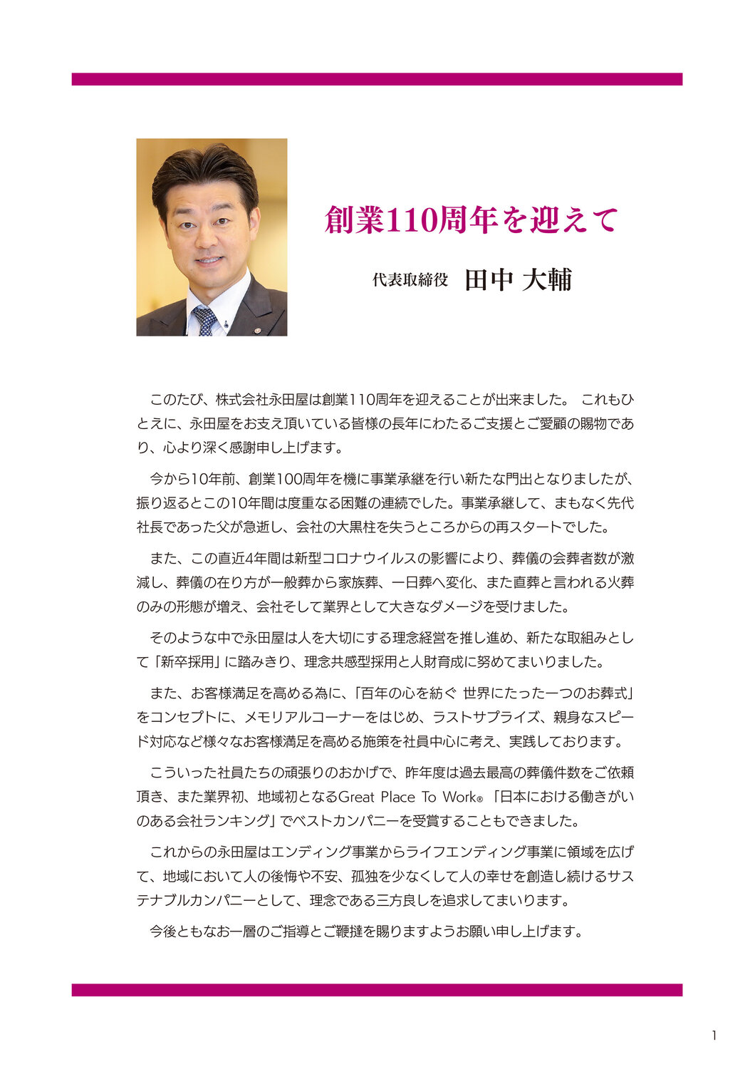 株式会社永田屋様が創業110周年を記念して発行した冊子。創業100周年の際にも記念誌を発行しており、今回の記念誌は主に創業100周年からの10年間をまとめました。この10年間は会社が大きく成長した10年であり、歴史や取り組み、社員紹介、社員座談会、お客様の声などを紹介しています。記念誌は110周年記念式典の場で来賓や関係者に配布されました。