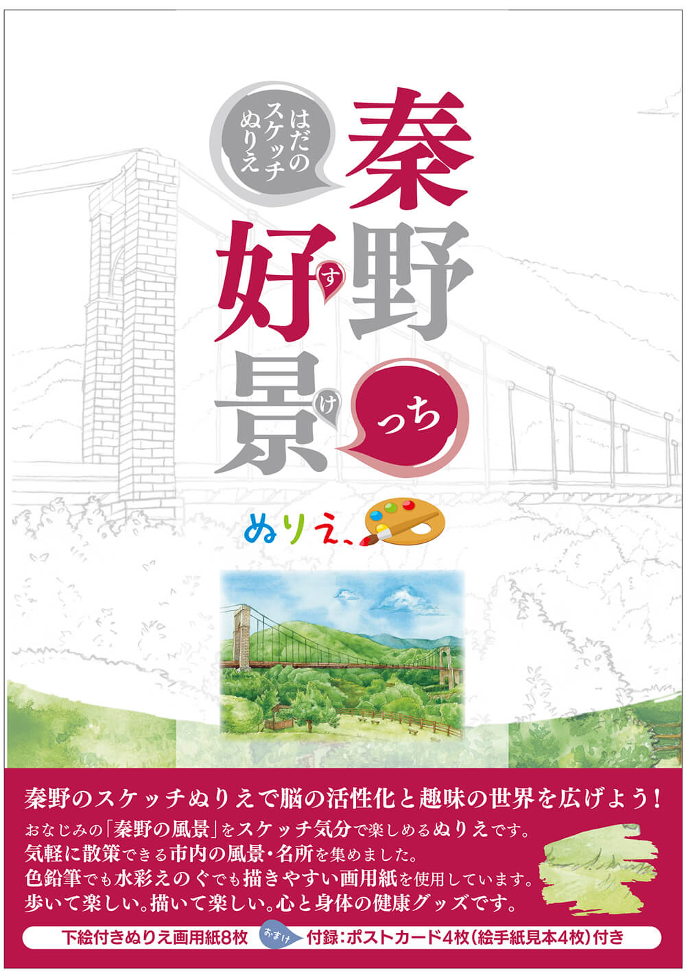 そんな大自然を満喫できる秦野の中で、「里地里山の風景を眺め、ハイキング気分を味わい(*紹介施設はほとんど駐車場があるし、バスでも行けます)、まるで自分がスケッチしたみたいな気持ちになってぬりえを完成させる」ことを目的に作成したのが、この『はだのスケッチぬりえ』です。